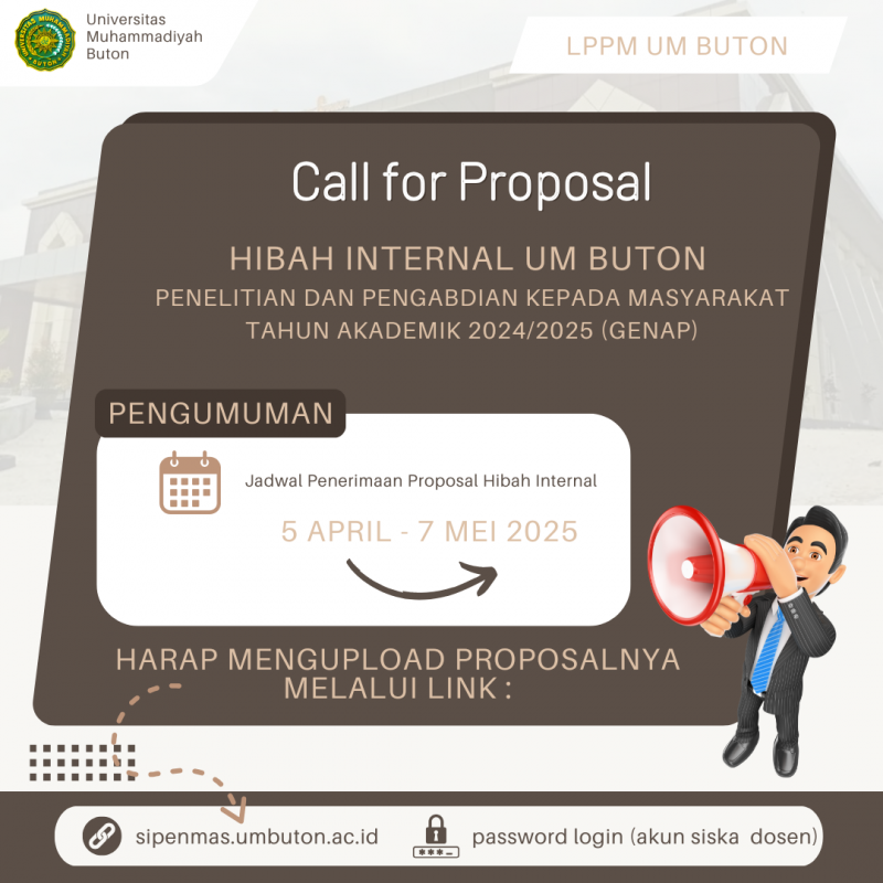 Lembaga Penelitian dan Pengabdian Masyarakat (LPPM) Universitas Muhammadiyah Buton membuka Penerimaan Proposal Hibah Internal untuk Tahun Akademik 2024/2025 Semester Genap Program ini bertujuan untuk meningkatkan kualitas dan produktivitas penelitian serta pengabdian kepada masyarakat di lingkungan Universitas Muhammadiyah Buton.